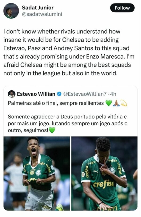 Estevao is set to officially join Chelsea in the summer of 2025, where he will be welcomed alongside another promising South American prospect, Kendry Paez. The duo is expected to bring a fresh wave of creativity and flair to the squad, which has been undergoing a transformation in recent seasons.