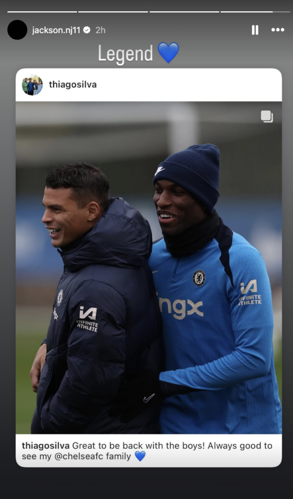 Silva, who has been a stalwart for Chelsea, shared a touching post on Instagram after attending the match and participating in a training session with the squad. In his post, he expressed his joy at being back with the team, stating, “Great to be back with the boys! Always good to see my Chelsea family.” Jackson, in response, reposted the image on his own story, simply captioning it with “Legend” and a blue heart emoji, showcasing the camaraderie within the squad.