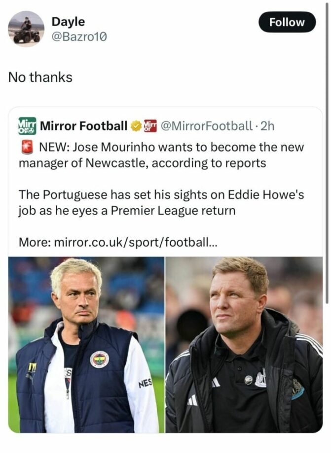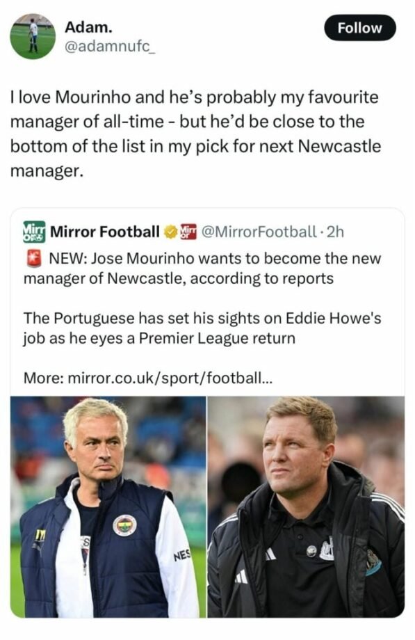 In the wake of the Mourinho news, Newcastle fans have taken to social media platform X (formerly known as Twitter) to voice their support for Howe. Many have shared their thoughts, urging the club to continue backing their current manager rather than pursuing a high-profile replacement. The sentiment among the fanbase reflects a growing appreciation for Howe’s work and the progress made under his leadership.
