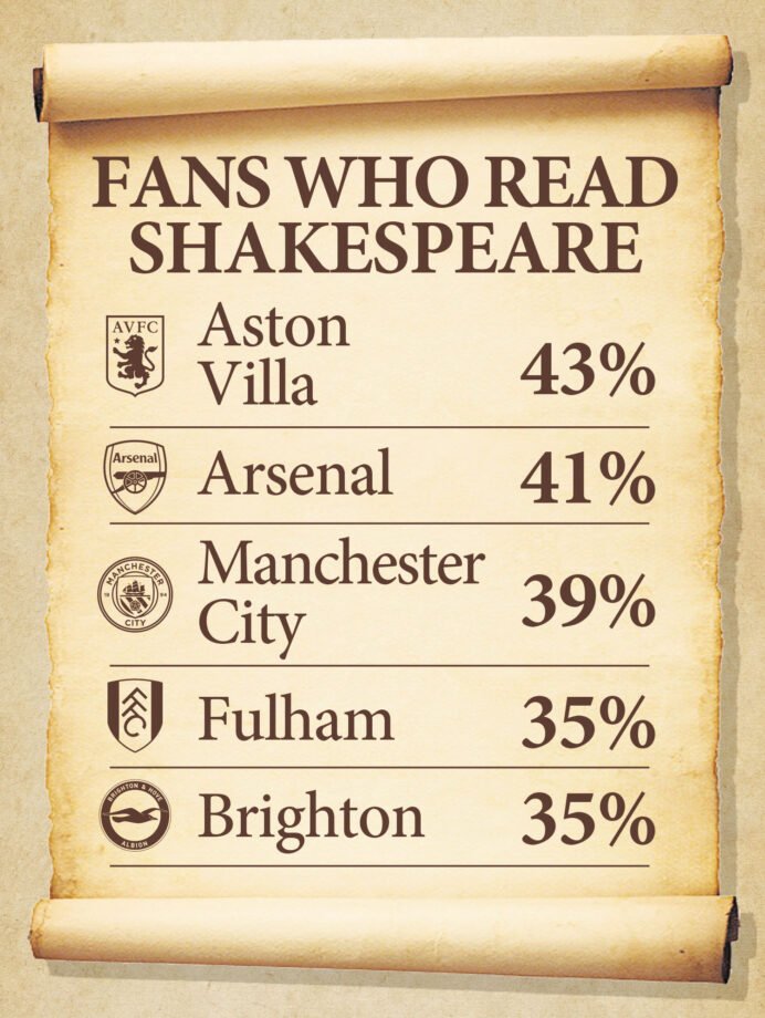 Overall, the survey—which took the pulse of 2,000 football fans, with a centenary representation from each Premier League club—uncovered that a national average of 26 percent enjoy the works of England’s most famed writer. This statistic comes just as the new Premier League season is set to commence, painting a picture of a fanbase with diverse interests beyond the pitch.